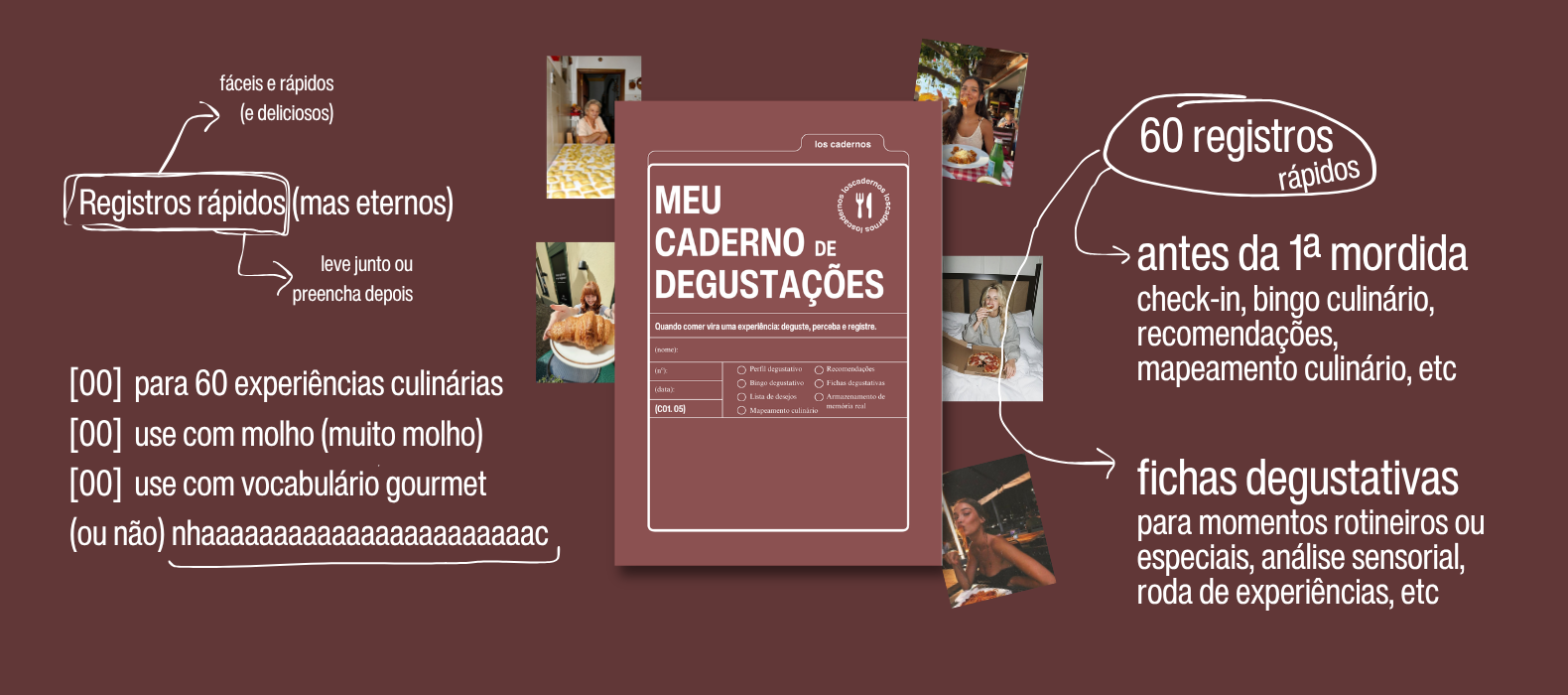 Use para registrar até 60 experiências, entre restaurantes, pratos inesquecíveis, receitas que deram certo (ou muito errado), combinações curiosas, descobertas inesperadas ou simplesmente aquele momento em que comer foi mais do que só matar a fome.