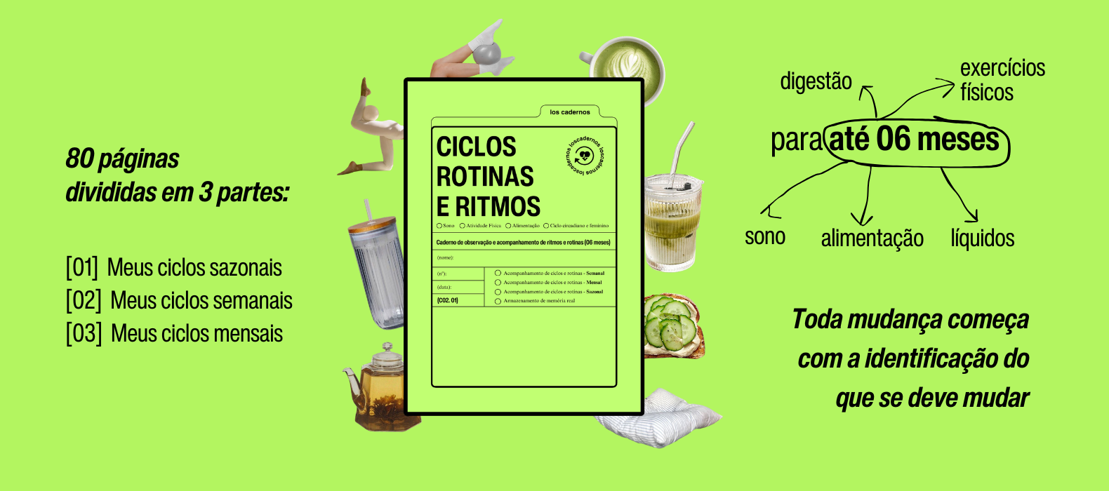 Este caderno acompanha SAÚDE, ATIVIDADE FÍSICA, SONO, DIGESTÃO, CICLOS, ALIMENTAÇÃO (e mais muuuitas coisas) de um jeito honesto e observador.